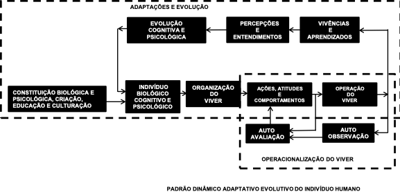 O indivíduo vive segundo um padrão dinâmico adaptativo evolutivo, em que sua evolução cognitiva e psicológica pode leva-lo a percepções e entendimentos que acabam por dar racionalidade ao seu egoísmo, levando-o a considerar e cuidar como de seu verdadeiro interessea vida em esquemas coletivos. Nesse constatado padrão de vida, a constituição biológica e psicológica, juntamente com as características adquiridas nos processos de criação, educação e inserção cultural, propiciam um indivíduo biológico, cognitivo e psicológico único que organiza seu viver e desenvolve sua vida segundo dois ciclos. Um de curto prazo, de operacionalização do viver, em que com suas ações, atitudes e comportamentos vai vivendo o dia a dia, se auto observando e se auto avaliando, ajustando suas ações, atitudes e comportamentos segundo o que sabe e percebe, isto é, segundo sua condição conjuntural de ser cognitivo psicológico. Vive também um ciclo de médio prazo, de adaptações e evolução, resultado da inescapável interação com o meio ambiente, em que adquire novas vivências e aprendizados, recompondo percepções e entendimentos, que provocam sua evolução cognitiva e psicológica, que consequentemente alteram sua condição de indivíduo biológico, cognitivo e psicológico, o que o leva à reorganização de seu viver, de modo a readaptar e inovar suas ações, atitudes e comportamentos e assim por diante.