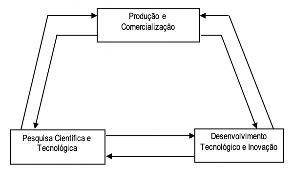 O atendimento competitivo de mercados demanda negócios eficazes e inovadores, que se sustentam em resultados de desenvolvimentos e inovações tecnológicos, que por sua vez se sustentam em desenvolvimentos científico-tecnológicos, via-de-regra. Há, pois, uma meta-ordem no processo de desenvolvimento tecnológico, que vincula a existência de subprocessos básicos. A diferença de eficácia de resultados destes subprocessos implica na necessidade de soluções organizacionais distintas para a efetivação de cada um deles, assim como do encadeamento entre eles. Para que se efetivem condições de competitividade tecnológica no país, o relativo sucesso alcançado nas academias para o subprocesso de pesquisa científica e tecnológica, tem que desencadear sucesso que se repete nas outras partes do processo de desenvolvimento tecnológico, para efetivar soluções para o domínio tecnológico competitivo nas empresas. Embora a questão do domínio tecnológico nas empresas se resolva com estratégia e soluções próprias, este domínio tecnológico pode e deve se sustentar no respectivo setor empresarial para esforços básicos e pré-competitivos, através de empreendimento cooperativo. Pode e deve, também, se sustentar na existência de negócios, no “meio de campo”, de intermediação entre as academias e o mundo empresarial. Enfim, a solução é ter soluções para todas as partes do processo e ter soluções que mantenham abertas condições para todas as possibilidades de intra e inter-relacionamentos (Fig. 1).